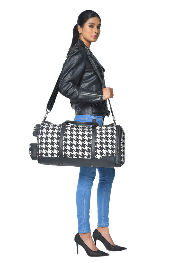 Part of Our New Collection, this Jacquard Fabric rendered in a Black and White is a chic and durable Backpack that will add Contemporary Cool wherever you go. The SHARO Backpack has a pared-down silhouette, reminiscent of a classic school backpack. The modernized design is crafted in White and Black jacquard, ans is perfectly sized for use as a Walk On Personal item for Airplane Travel! (It will store neatly under your seat. You can pack shoes and clothes and personal affects that will last you on a four day excursion!) Or for everyday use, college campus use, you are in command. An exterior front pocket offers added storage for your cell phone, keys, or other frequently used items. With a convenient top grab Leather Handle Option for traveling short distances. Enjoy your SHARO Bag!